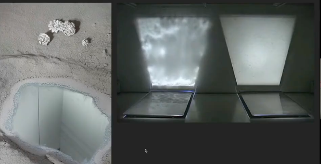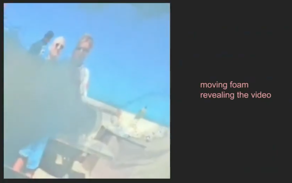 Light diffraction proved to be another significant challenge. Marine and Raphaël tested projecting onto mirrors and glass, investigating different solutions for video capture and rendering. They also experimented with a black box setup, but ultimately the results they were looking for came from a simpler solution: a metallic tray filled with water and bubbles.
