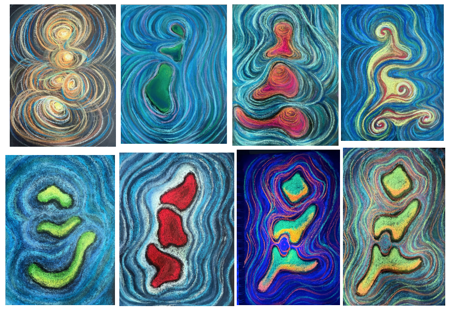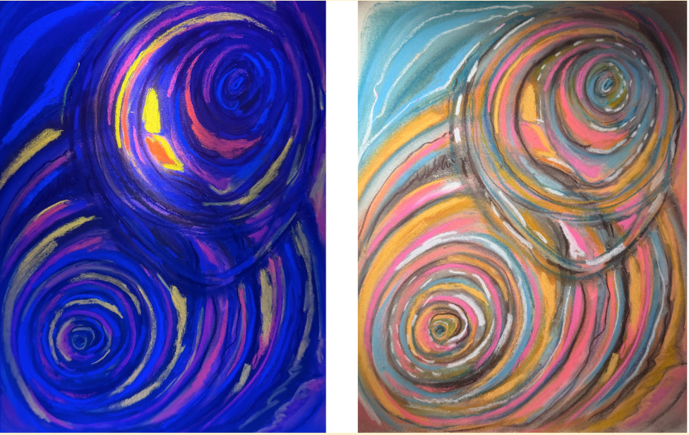 Leila began by experimenting with dry pastels while listening to a song recorded by Paul Knapp off the coast of Tortola. She colored glyphs created by tracing the average shapes that resulted from overlaying many occurrences of the same unit across Knapp's recording, using them as a springboard to develop her work. As she reflected on the process: "I thought about how the songs originate from the whale and move out to the ocean as waves, and then there is nothing left behind, that is why the shape disappears. Kind of poetic. These two images also remind me of beautiful galaxies and how planets revolve around the sun, creating beautiful oval and circular trajectories." The preparatory works she created using fluorescent pastels reminded her of deep-sea creatures and their bioluminescence, especially once lit up under black light.