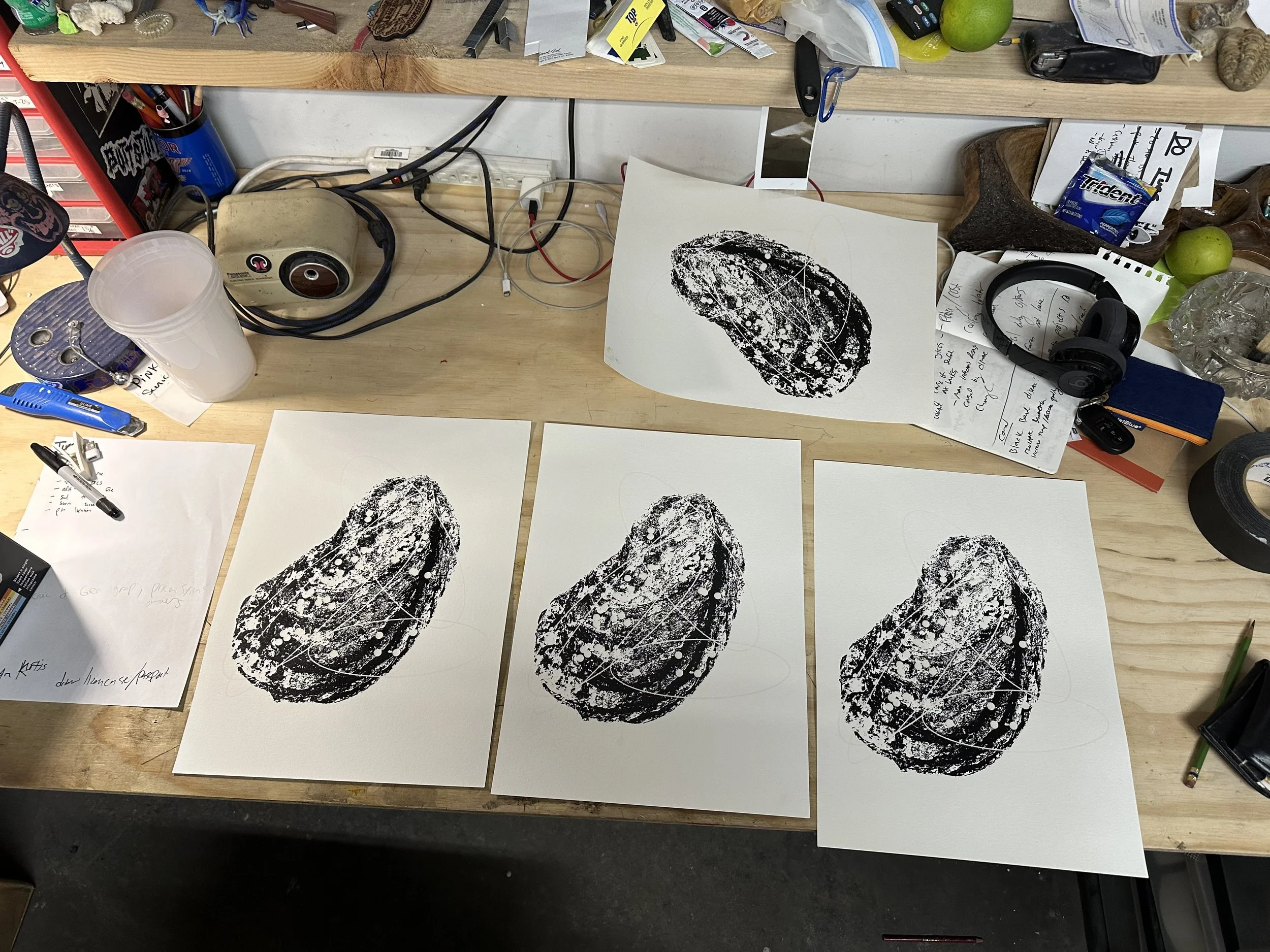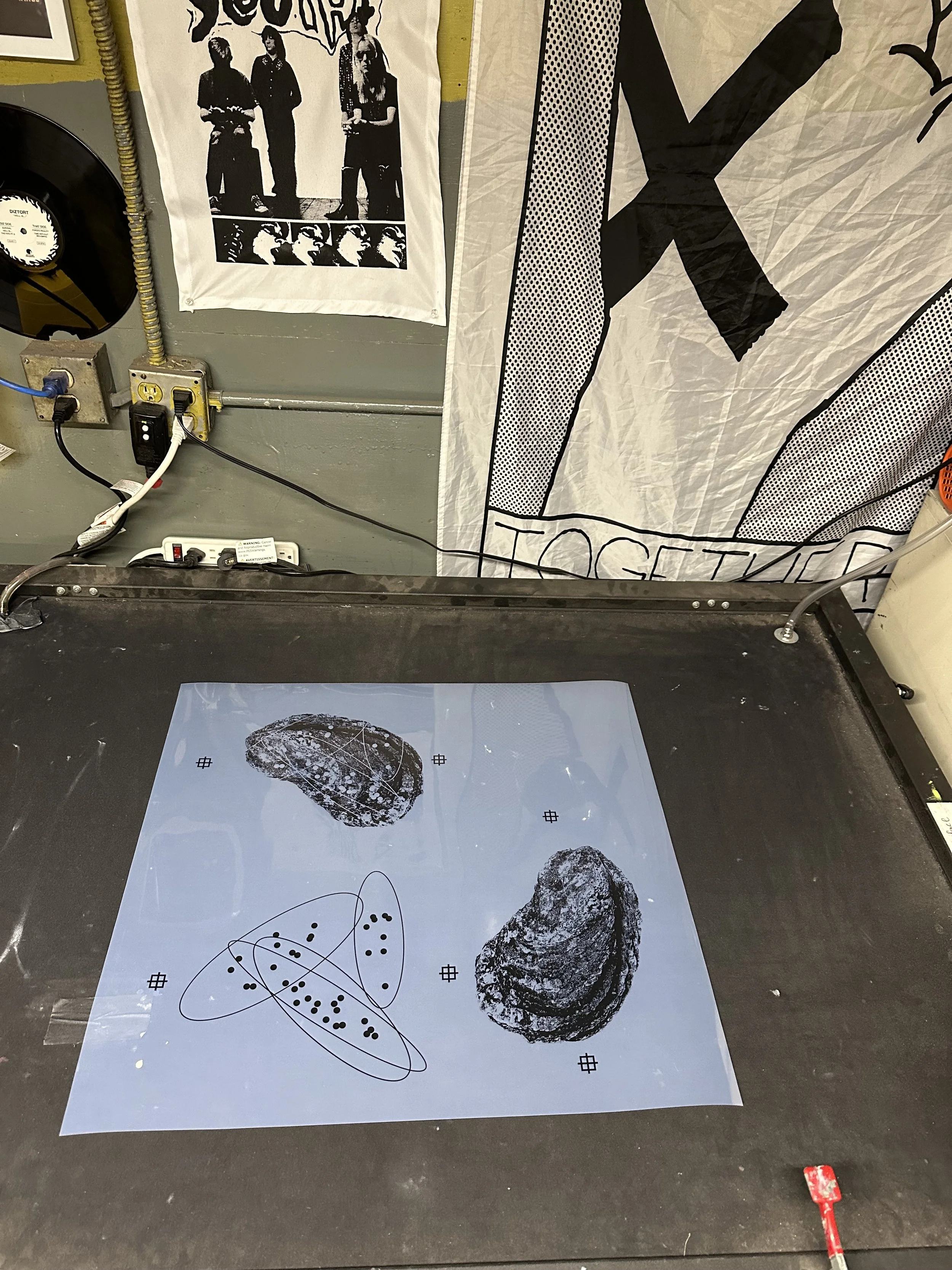 A turning point came when Dr. Emily Kunselman spoke to the artists. Richard felt compelled to reach out to her and learn more about her work, she specializes in studying oyster behavior in the face of disease. Her research resonated deeply with him, and the two went on to collaborate: Emily shared specific scientific data from her research, and Richard interpreted that information into a series of prints that are visually striking in their balance of absolute minimalism, scientific data, and his own artistic perspective on the state and situation of oysters. This exchange has since opened the door to further collaborations with other marine scientists.