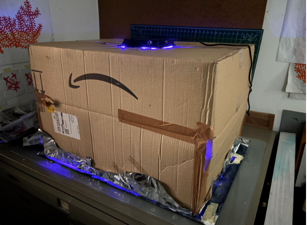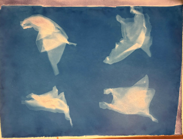 Natalie's main challenge for the residency was to create a cyanotype of a life-size manta ray, the average manta has a wingspan of 3 meters. In her cyanotype work, Natalie explores a process that results in a masterful handling of movement, sunlight, and shadows beneath the ocean surface. Because she lives in the UK, where weather can be cloudy and rainy, and cyanotypes rely on exposure to sunlight, Natalie built her own exposure box using a UV lamp, a box, and kitchen foil, allowing her to work regardless of the conditions outside. This let her experiment with ways to capture the wing movement of the manta to show it "flying," as well as test different mix ratios of "phosphorescent pigment powder with screen printing medium."
