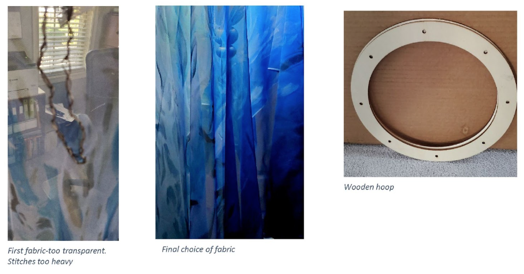 To capture an accurate representation of water and our relationship with it, Heather wanted to create "lightweight, free-moving banners that are hung from the ceiling so that visitors walk through the installation. If the banners are light enough, they should move with the breeze created by the person moving through the installation. This would represent the impact of a single human on the ocean."