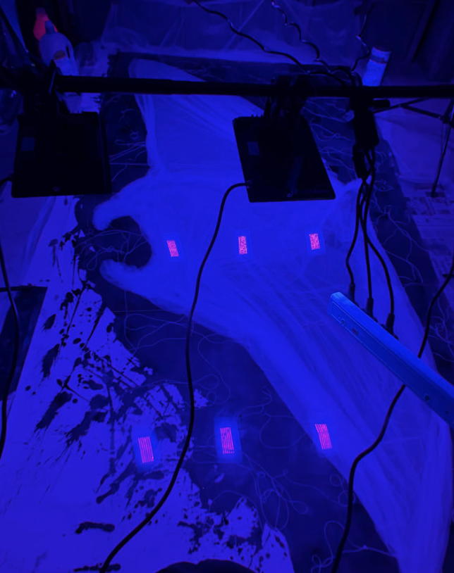 Leila's project during the residency explored the beauty and decline of whale songs, "transforming their sound patterns into visual compositions through mixed media." Leila was incredibly excited not only about her exploration of the theme but also because this was her first art residency. In her practice, the ocean becomes both subject and collaborator, a space for expression and reflection. She was eager to experiment with new art supplies and particularly excited by the challenge of working with paint and color that would show under black light.